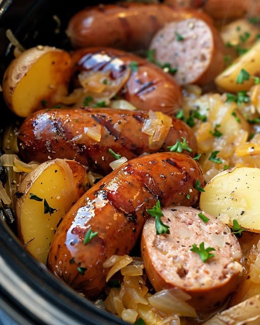 Slow Cooker Bavarian Bratwurst with Sauerkraut and Potatoes