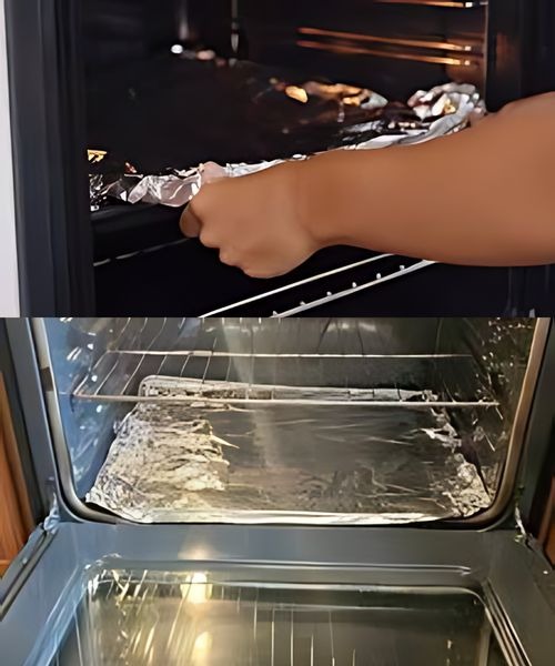 Next, spread a sheet of aluminum foil on the walls, bottom, and glass of the oven. The aluminum will stick to the water immediately.
